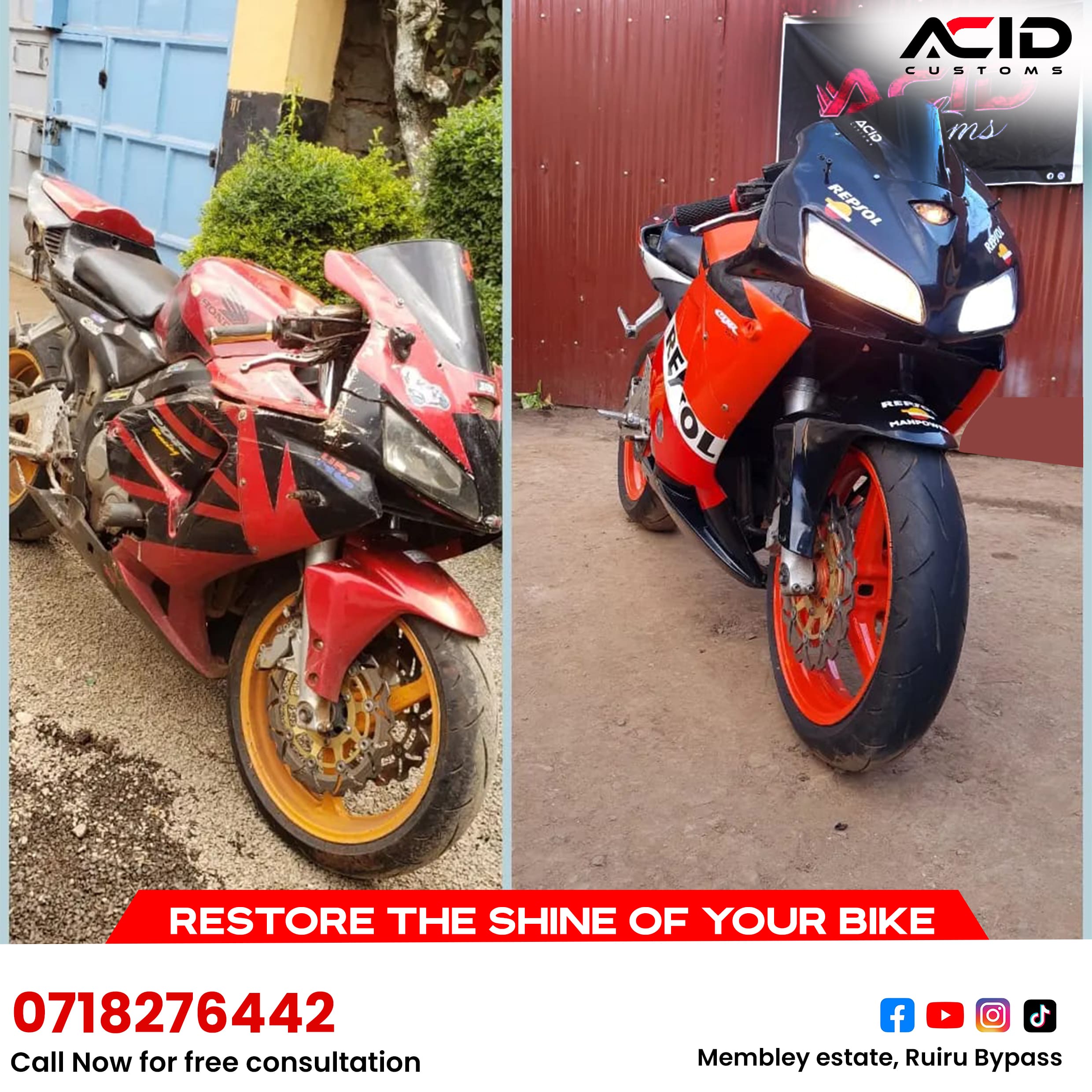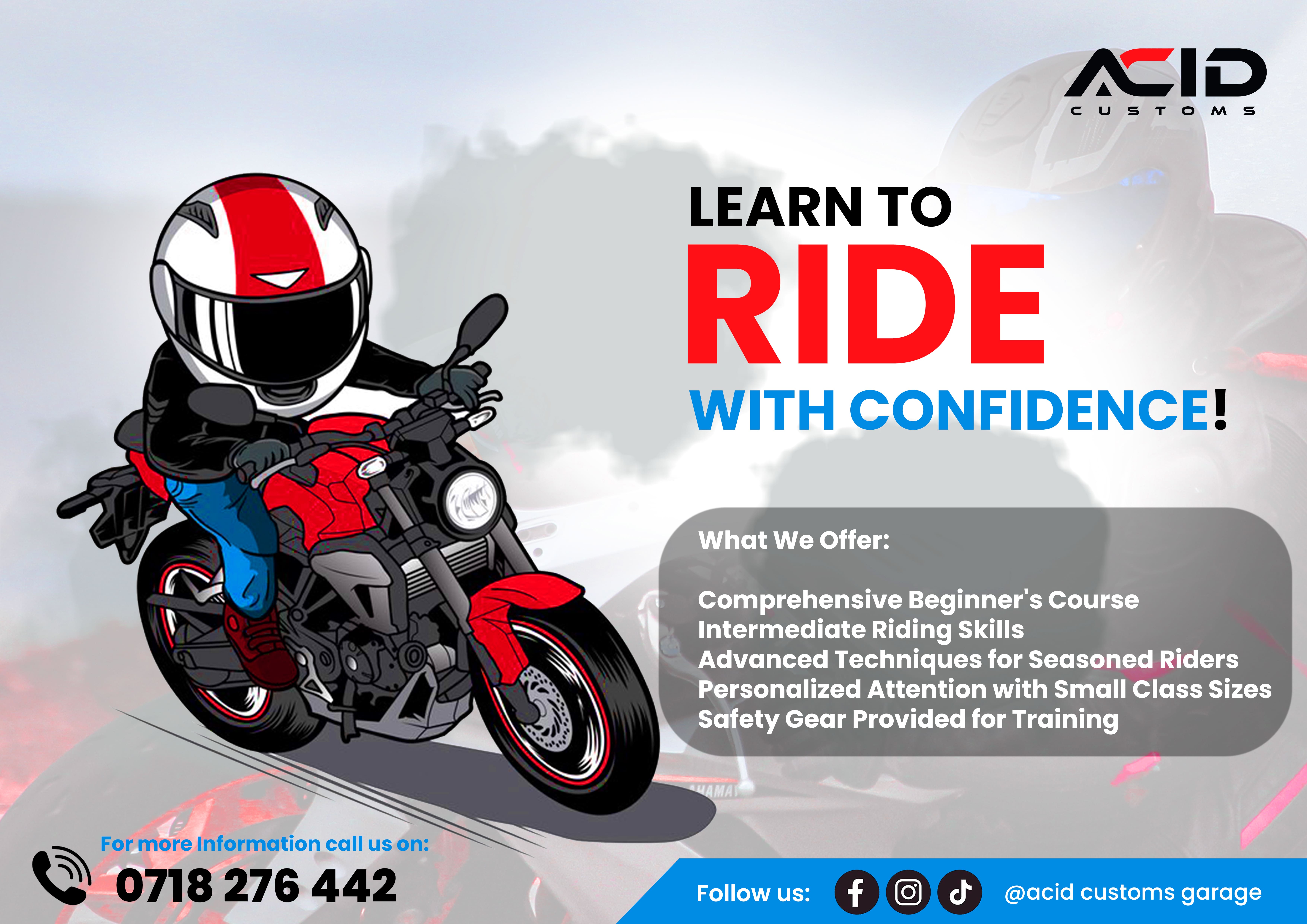 At Acid Customs, the main goal is to have riders who are safe and responsible on the road. Students will be trained by a certified tutor to ensure they get the best training for a modern rider.